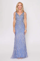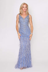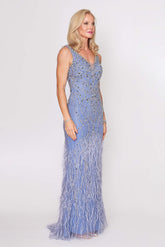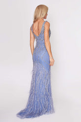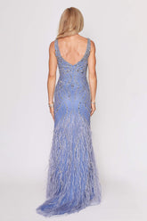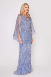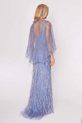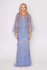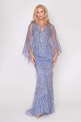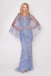 Wedgewood Blue Beaded Tulle Long Dress with Train & Matching Removable Cape